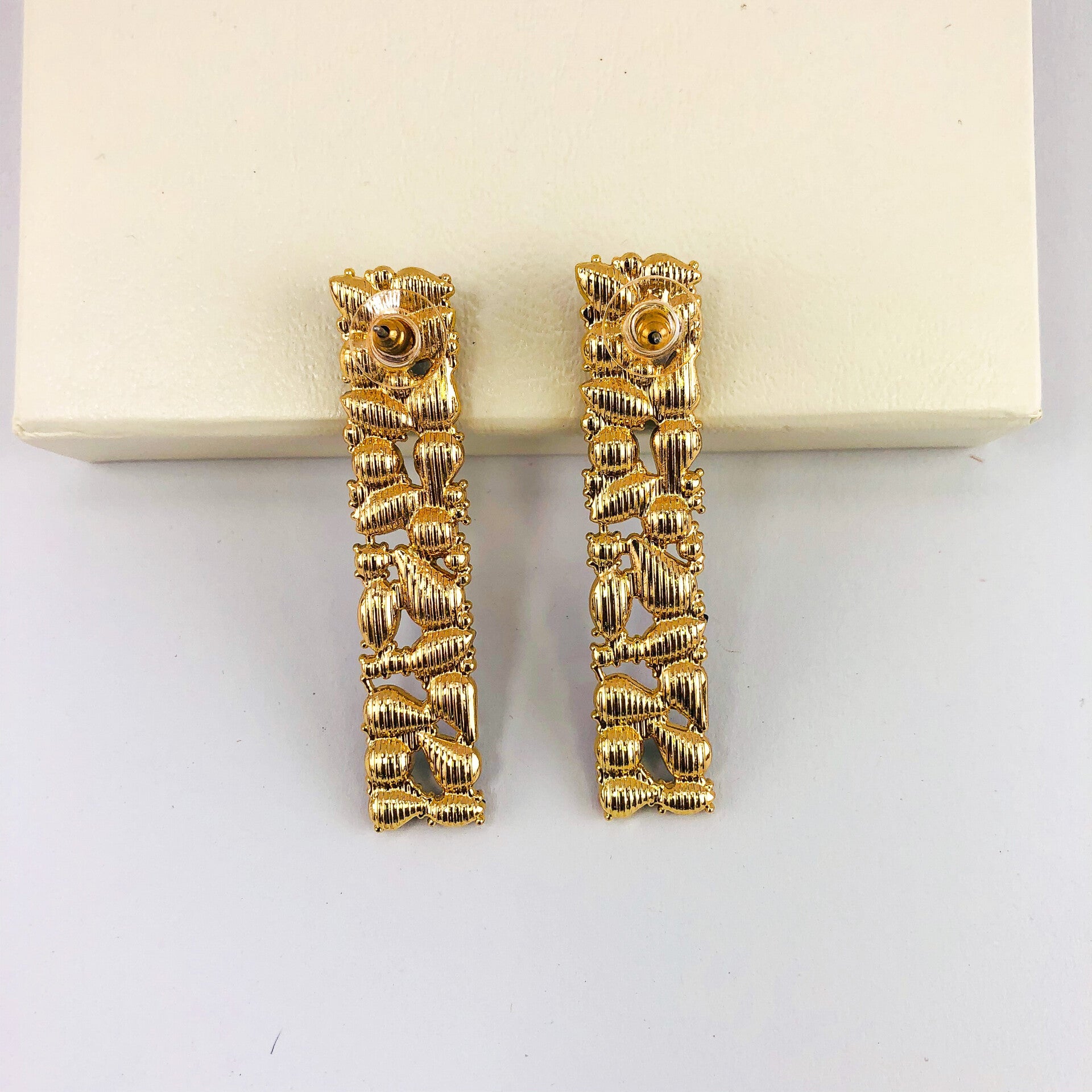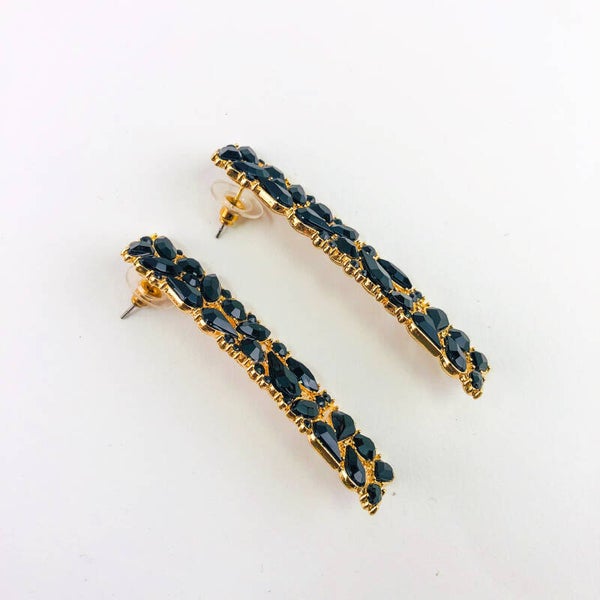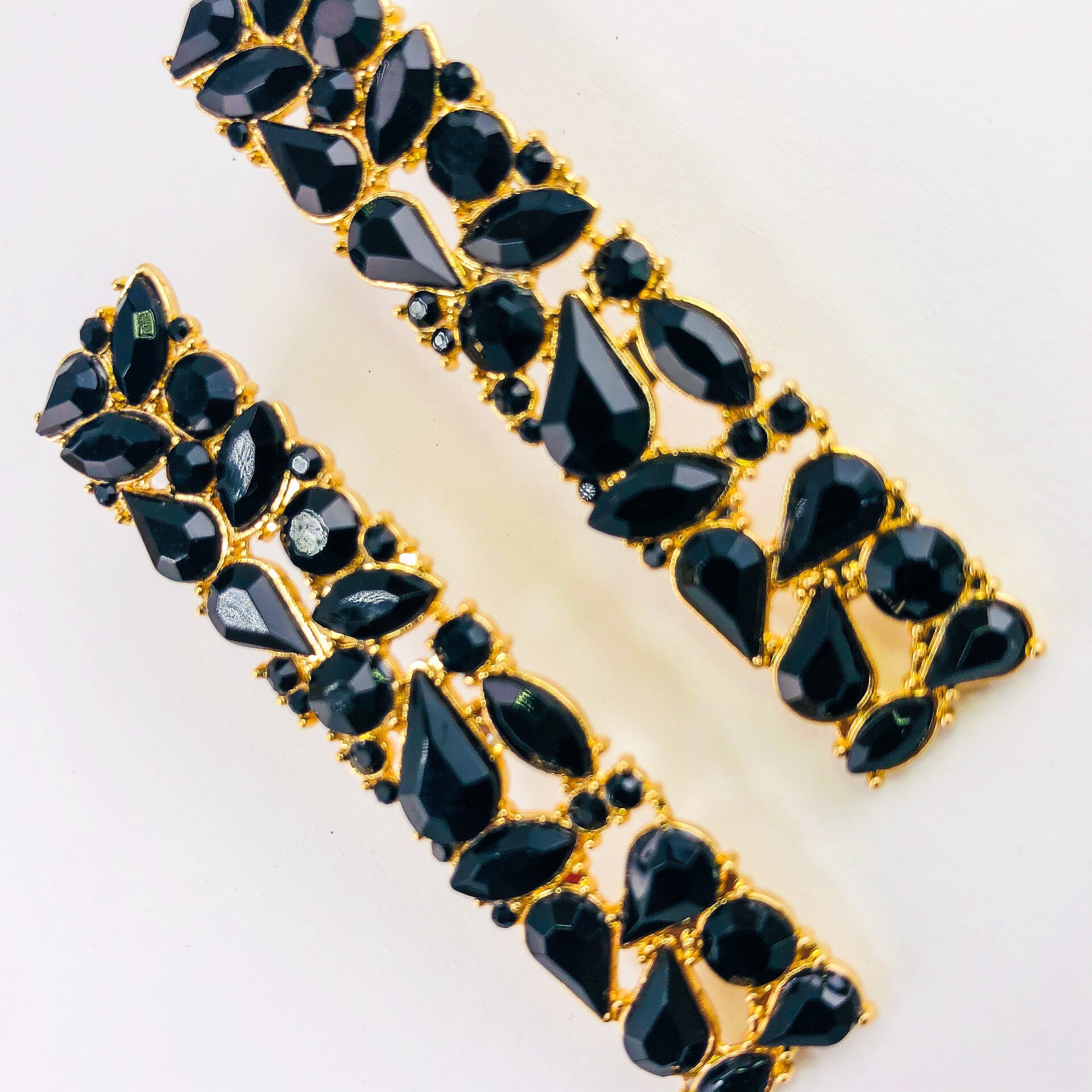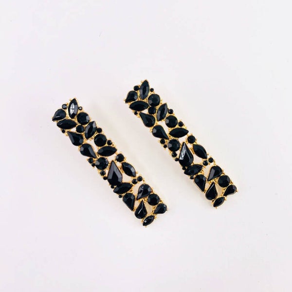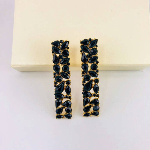 COR: preto, base douradaPESO: 17g o parDIMENSÕES: 1.3cm x 6.2cmMATERIAL: Cristais, liga de zinco , aço inoxidável